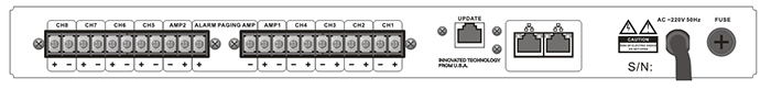 ●8路分區(qū)輸出,可同時(shí)聯(lián)接2臺(tái)IP網(wǎng)絡(luò)功放。